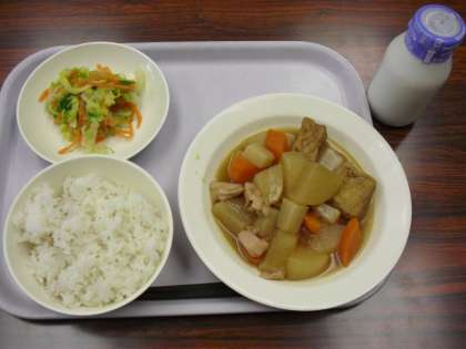 今日の献立は、ごま入りご飯、牛乳、大根と鶏肉のうま煮、そくせき漬けです。