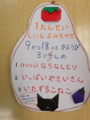 2学期最初のLLは、素話「ならなしとり」、読み聞かせ「いっぱいやさいさん」「いたずらねこ」の3つでした。