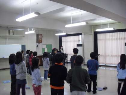 九品仏小学校合唱団も出演します。今、朝練習をしています。