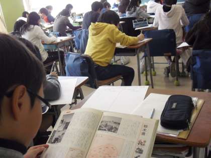 社会科・・・日本の地理・・・“庄内地方のくらし、岩手県と長野県、京都府、岡山県”などについて調べたことを画用紙一枚に新聞形式にまとめていました。