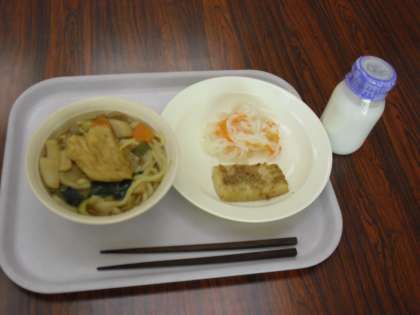 今日の献立は、餅入りきつねうどん、牛乳、いかの七味焼き、紅白なますです。