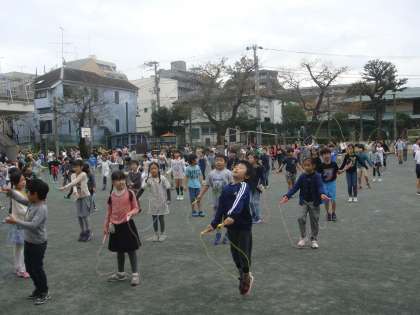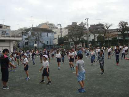 今朝の体育朝会は今年度最初の「短縄タイム」。前跳びや後ろ跳び、あや跳び、二重跳びと自分の取り組みたい技を練習しました。視聴覚室前には今年も縄跳び練習用「ジャンピングボード」を設置しました。ジャンピングボードを使って二重跳びやはやぶさといった難しい技をたくさんの子どもたちが跳べるようになるといいですね。