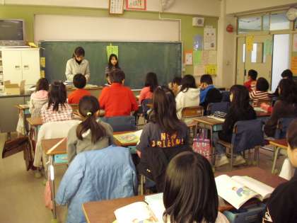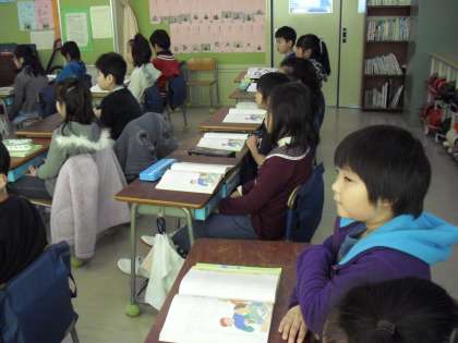3年生の教室・・・“朝の会”で日直の話・・・旅行に行った時の話をしていました。