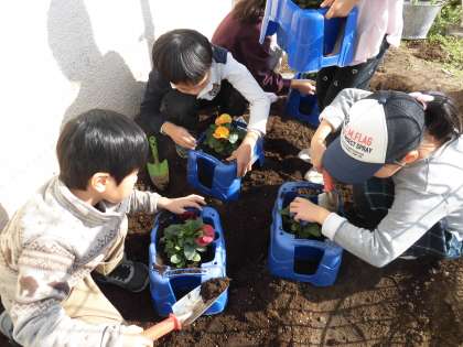 2年生は生活科の学習でパンジーの植えかえをしました。ポットに入っているパンジーをそっと出し、丁寧に土を入れて、水やりをしました。