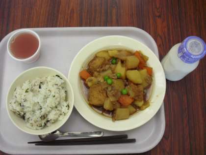 今日の献立は、わかめご飯、牛乳、肉じゃがうま煮、クランベリーゼリーです。