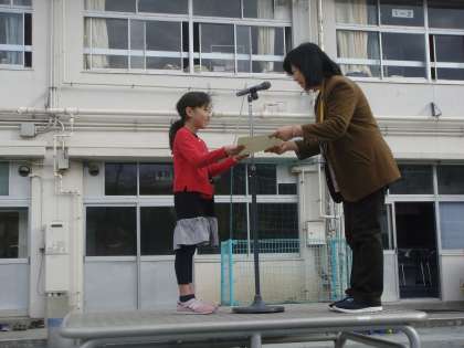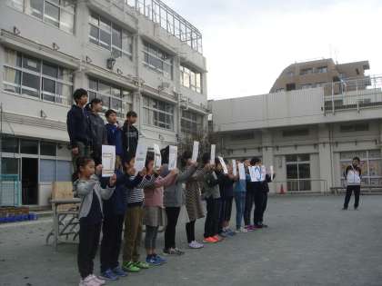 今朝の児童朝会では、読書感想文の表彰を行いました。毎年、夏休みに読んだ本の感想文の中から学年代表を選出し、区の読書感想文集「ともしび」を編纂します。今年も各学年6人の作品を出品しました。区への出品は東京都の読書感想文コンクールの予選を兼ねていおり、今年は2年生児童の作品が都に進出しました。作品は「ともしび」に掲載されますので、ぜひお読みください。また、代表委員会より「ユニセフ募金活動」の報告もありました。募金額は45,508円になりました。ご協力ありがとうございました。募金はユニセフ協会から、世界中の支援を必要とする子どもたちに届けられます。