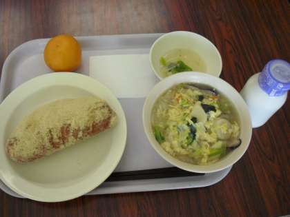 今日の献立は、きな粉パン、牛乳、卵雑煮、くだものです。今日もアレルギー対応食を調理員さんが作りました。