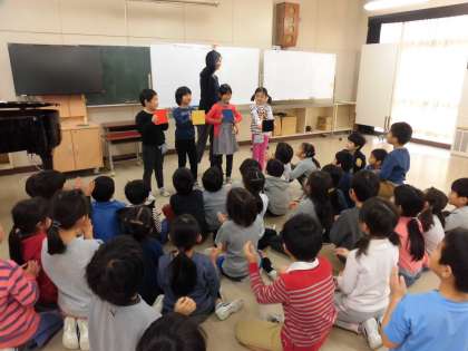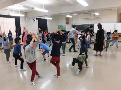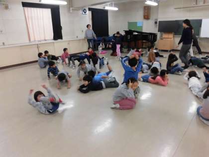 リズムに乗って歩いたり、手拍子で休符を表現したり、体全体でリズムを感しました。今回はクリスマスをテーマに授業を作っていただいて、子どもたちがクリスマスツリーやトナカイになりきる場面もあり、笑顔いっぱいの楽しい時間になりました。