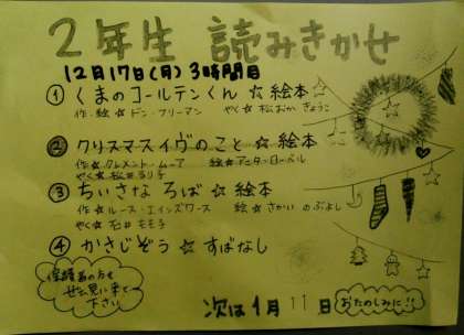 今日は2学期最後のLアンL読み聞かせでした。「くまのコールテンくん」「クリスマスイヴのこと」「ちいさなロバ」の読み聞かせと「かさじぞう」の素話をしていただきました。今日のお話は、クリスマスや季節のものでした。「かさじぞう」は国語の時間に読んでいる「かさこじぞう」と比べながら、よく聞いていました。クリスマスの手遊びも教えていただきました。