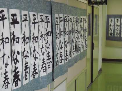 土曜日(1月22日・土)に行った“子どもフェスティバル”のことを話していました。“お化け屋敷”大盛況!大成功でした!・・・後片付けも・・・さすが、6年生です。廊下には、校内書き初め展の作品“平和な春”が展示されています。