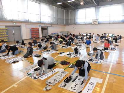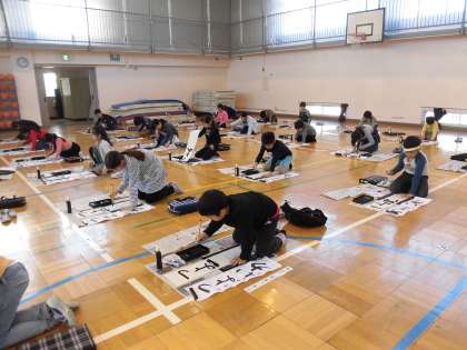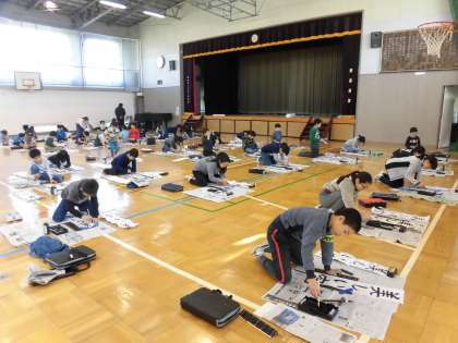 2学期から冬休み中も何度も練習してきた「つよい力」(3年)「美しい空」(4年)を、体育館という広い空間の中で、どの子も集中して書き上げました。