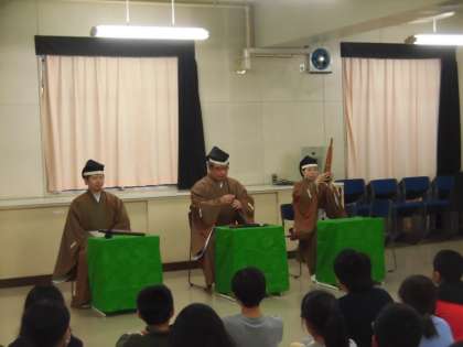 笙(しょう)・篳篥(ひちりき)・龍笛(りゅうてき)の3名の奏者にご来校いただき、2時間目に5年生、3時間目に6年生が雅楽教室を行いました。