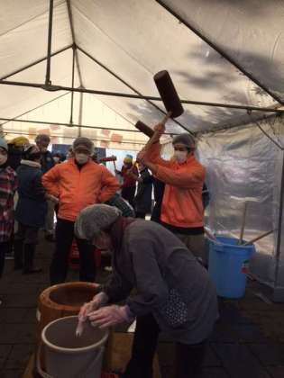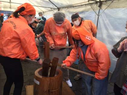 九品仏小学校からも、お餅のつき手として先生方が参加しました。つきたてのお餅は柔らかくとても美味しいと評判でした。