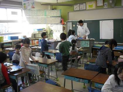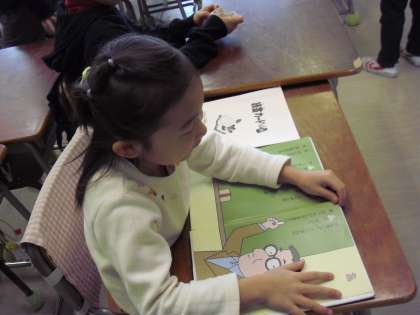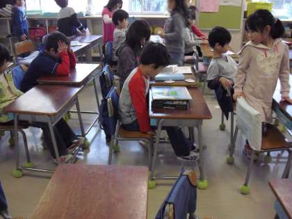 “朝の会の前のようす”・・・朝読書をする子ども、先生に相談に育子ども・・・