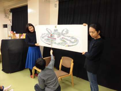 除雪車「けいてぃー」は、積雪で困っている町を助けます。絵本の読み聞かせのあと、けいてぃーがどこに助けに行ったのか、大きな地図で確認しました。