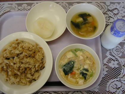今日のメニューは、中華おこわ、牛乳、中華風コーンスープ、くだものです。