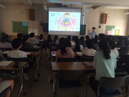 学校薬剤師の高橋先生による「薬物乱用防止教室」が行われました。授業前、なんとなく知っているという人が多かったですが、この授業を通して、薬物を一回でも使用すると乱用になること、体に及ぼす様々な影響、一生を台なしにする恐ろしいものだということ等を学習し、とても危険なもので、絶対にやりたくないと思う気持ちが強くなったようでした。最後に、薬物のサンプルを見て、ラムネのようなかわいらしいものなどもあることを知り、驚いていました。これから先、もし誘われたとしても、きっぱり断ることができる人になっていってほしいです