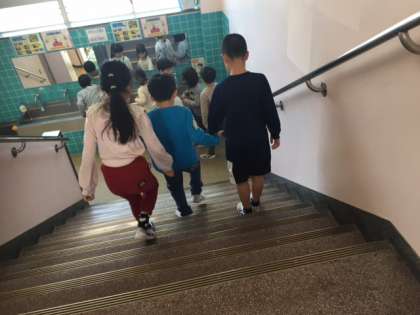 小学生は、教室で椅子の座り方やランドセルの背負い方を教えました。校内を巡って、小学生の生活をお話ししました。体育館では、「体ジャンケン」や「言うこと一緒やること一緒」のゲームを楽しみました。