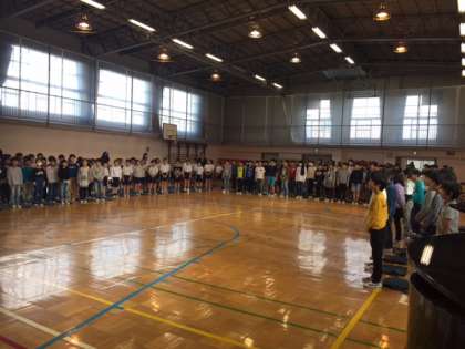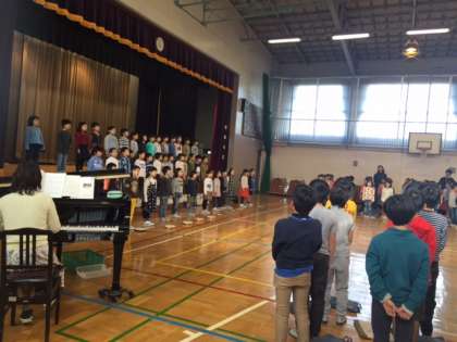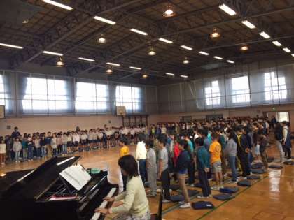 後半は、来週の6年生を送る会の全校合唱曲「U&I 」を全校児童で練習しました。
