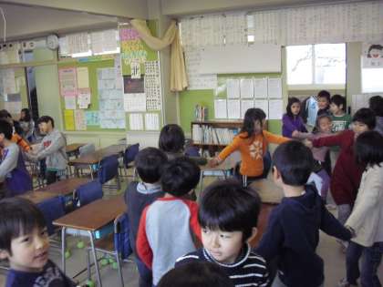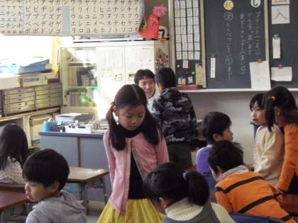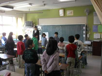 2年生の教室では、“朝の会”先生とみんなと朝の挨拶・・・・女の子の日直の話は、昨日お友達と遊んだことでした。