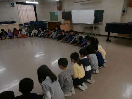 最後に、2年生全員で大きな輪になり、リズムに合わせてカップを送っていく活動をしました。複雑な動きで難しかったですが、何度も練習するうちに慣れてきて、できるようになりました。