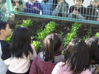 “児童朝会後”に学級園にいき・・・みんなで植えた“小松菜”の観察をしました。