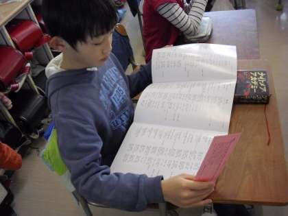 朝の会が始まる前の時間を・・・2月12日の日曜日の“東京都合唱祭のパンフレット”を見ている合唱団員・・・読書を楽しんでいる子ども・・・時間の使い方が上手です。