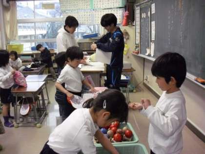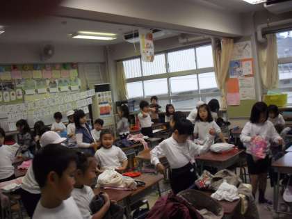 1年生の教室−始業前・・・先生は、ボランティアティチャーと配布物の準備・・・