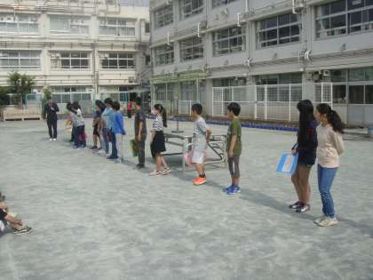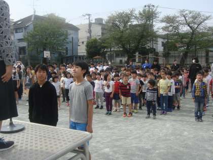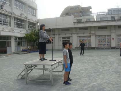 今日の児童朝会から、1年生が参加になりました。上級生と同じように時間前に整列をします。6年生のあいさつの後、校長先生や看護当番の先生のお話を聞きました。最後まで姿勢を崩さず、きちんと並んで参加できました。