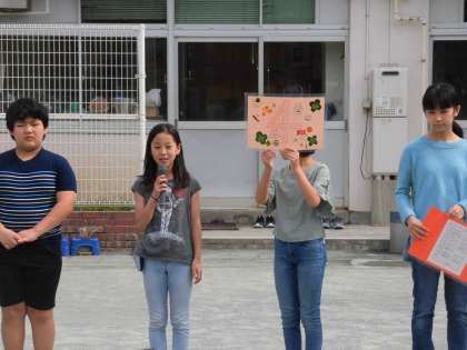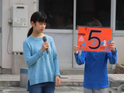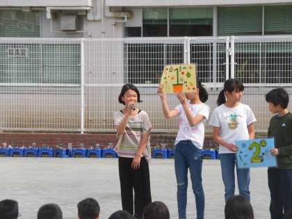 本日の児童朝会では、5月8日(水)の全校遠足に向けて、1〜10班まである縦割り班の班長・副班長の6年生がみんなの前で自己紹介をしました。