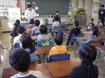 “朝の係活動”〜“朝の会”へ・・・今日は、ボランティアティチャーが担任の手伝いをします。