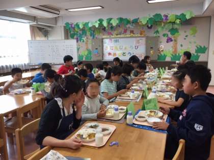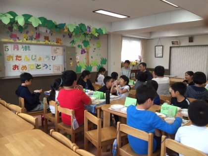 1年生から6年生まで全学年の5月生まれの子どたちがランチルームに集まり、楽しく会食しました。