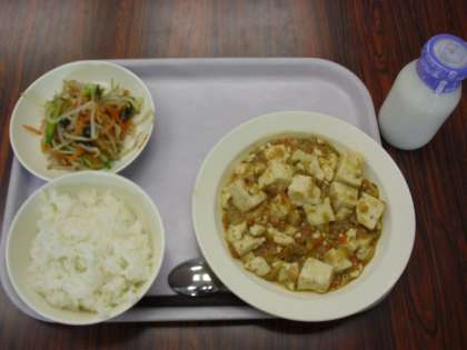 今日の献立は、ご飯、牛乳、麻婆豆腐、塩ナムルです。