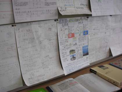 掲示物には、都道府県の特産などの学習のまとめと・・・情報ノート“新聞などで自分が選んだ記事に自分で考えたコメントを・・・・。”