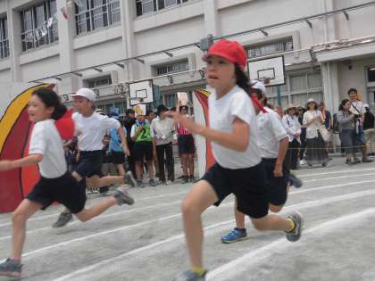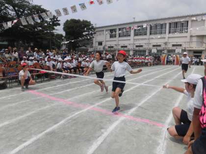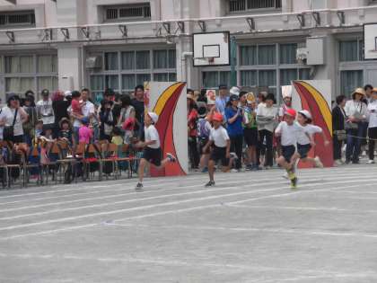 4年生のかけっこです。ゴールめがけて全力で走りきる姿が光っていました。
