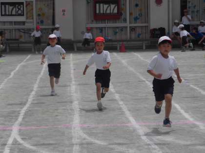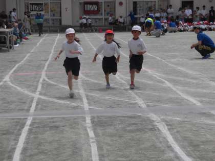 初めての運動会、1年生のかっけこです。ゴールの向こうまで一生懸命走り向けることができました。