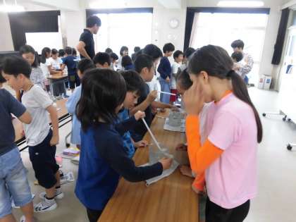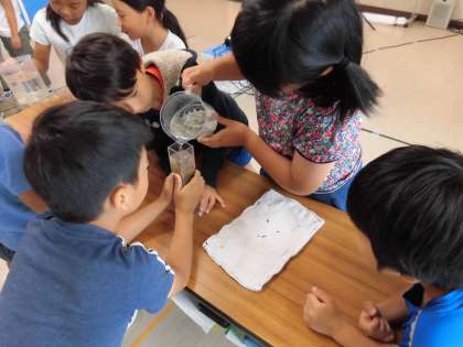 水が水源からじゃぐちに届くまでの道のりを映像でわかりやすく教えていただいたり、沈でん、ろ過実験を行い、水がきれいになる様子を観察したりしました。子どもたちは、初めて知ることに興味深々で、熱心にメモをとり、真剣に実験に取り組んでいました。