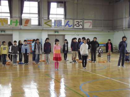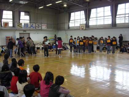 6年生への感謝を込めた寸劇を・・・おちは、クラブ発表会のアウトドアークラブの振り付けをまねました。