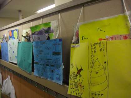 廊下には、図工の作品が飾ってあります。作品を入れる袋も図工の作品に・・・いいアイディアです・・・