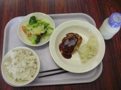 今日の献立は、ごま入りご飯、牛乳、豆腐入りハンバーグ、じゃが芋のクリーム煮、ブロッコリーサラダです。