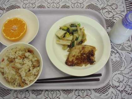今日の献立は、こぎつねご飯、牛乳、魚のかわりソースかけ、かまぼこと青菜のからしあえです。