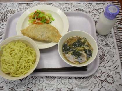 今日の献立は、つけ麺、牛乳、ジャンボ餃子、ひとしお野菜、アイスクーリムです。