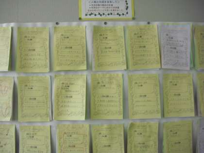 廊下には、“人格の完成を目指して”の取組みの一人一人の反省コメントが・・・掲示してあります。6年生のいない九品仏小学校は、寂しいです。早く元気に・・・。