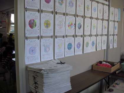 廊下には、“生活科のコマのデザイン表”が掲示され・・・3学期に取り組んだ学習の足あと・・・プリントが持ち帰りやすいように整理されていました。