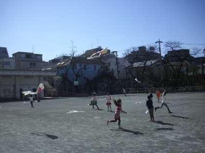 “生活科:凧上げ”・・・今までの学習で作った“凧”をあげました。糸が絡んでしまった子どももいました。5メートルくらい高く上がった子どももいました。
