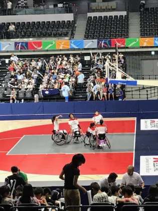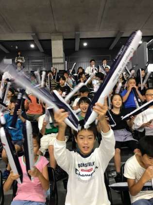 武蔵野の森総合スポーツプラザに到着しました。応援グッズをもらって練習中の日本代表女子チームの応援をしています。