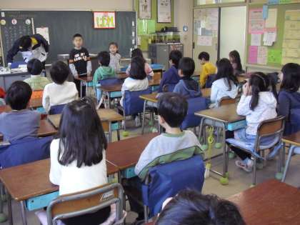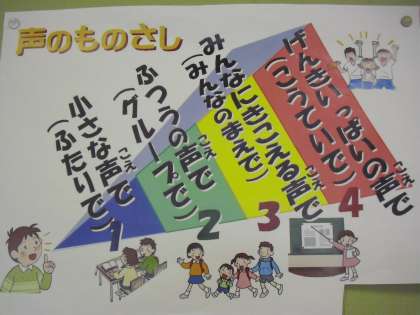 日直が前に出て、朝の会が始まります。“声のものさし”が掲示され・・・いつでも確認ができます。