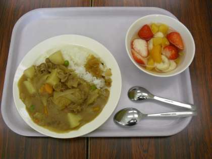 今日の献立は、カレーライス、福神漬け、フルーツです。食材が一部変更しましたが、栄養士さん、調理員さんが頑張ってくれています。
