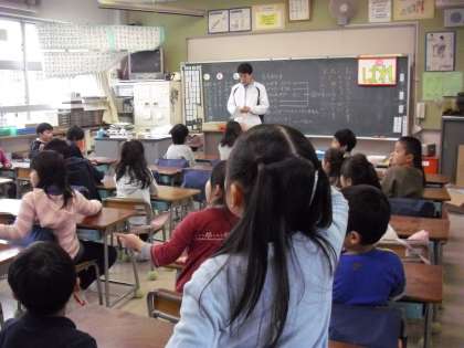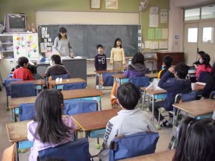 2年生の教室では、日直が前に出て“朝の会”を始めるところです。