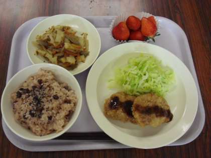 今日の献立は、お赤飯、一口かつ、茹でキャベツ、きんぴら煮、くだものです。